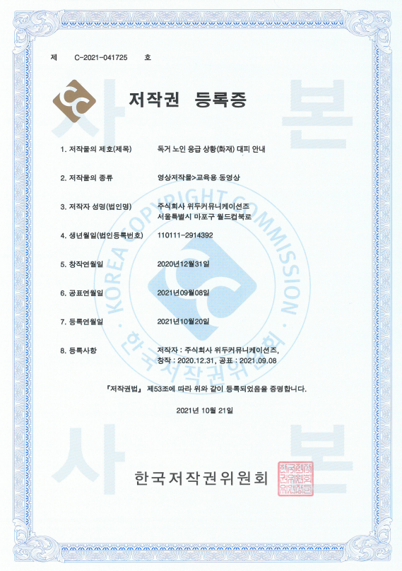 [한국/저작권] 독거 노인 응급 상황(화재) 대피 안내 페이지 정보 작성자 WeDu 댓글 0건 조회 5,891회 작성일 21-12-31 12:41 본문 2021-10-21 저작권 C-2021-041725 영상저작물>교육용 동영상 List Previous[한국/저작권] 장보기 인지훈련 게임 21.12.31 Next[한국/저작권] OLL KIDS/MATH 21.12.31